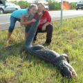 Sometime during the early morning of June 4th a car traveling on Pine Island road just west of Matlacha struck and killed an 8-foot alligator.   Whomever hit this gator had to know they hit something huge.   It appears the gator crawled to the side of the road where it died.   Cars were lined up along Pine Island road to see the reptile.   Deseree Flores and Amanda     Lavigne, residents of Pine Island said,  “We have never seen a gator this big.    It's not often you can stand this close to an 8 foot gator and then walk away with all your extremidies.”     During the months of May and June is the peak of alligator mating season, resulting in large gators moving between bodies of water in search of mates.    Their movement makes them more visible during these months.