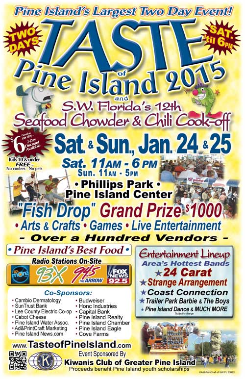 The Kiwanis Club of Greater Pine Island will hold the annual Taste of Pine Island on Saturday, Jan. 24 from 11 a.m. until 6 p.m. and Sunday, Jan. 25 from 11 a.m. until 5 p.m. The event will take place at Phillips Park (5675 Sesame Drive) on Pine Island Road behind the Pine Island Fire Station in Bokeelia. Single day tickets are six dollars, two-day passes are ten dollars and children 10-and-under are free. Event planners expect over 5,000 in attendance per day.