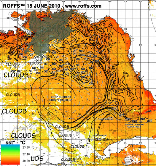 We have been conducting the analyses on a daily basis. We have been involved in many projects One was a joint Univ. of Miami Cooperative Institution for Marine and Atmospheric Sciences (CIMAS) - NOAA research project (see http://www.rsmas.miami.edu/pressreleases/20100612-noaa.html) by providing our analyses to the Research Vessel Walton Smith. Reports from this research cruise confirmed the presence of surface and subsurface oil in several areas that we had been reporting from our satellite observations. In addition, the ocean current drifters also verified some of the currents that we have been showing as well. See http://www.aoml.noaa.gov/phod/dhos/drifters.php for more details. We have many years experience of using ocean current drifters in addition to ship reports ( other research vessels, fishing vessels and ocean tugboats) along with our satellite analyses which have clearly demonstrated that our satellite oceanographic techniques are valid. Roffer's Ocean Fishing Forecasting Service, Inc. (ROFFS) 60 Westover Drive, West Melbourne, Florida 32904 U.S. Toll Free 800 677-7633 and 321.723.5759 / /WWW.ROFFS.COM Email: fish7@roffs.com